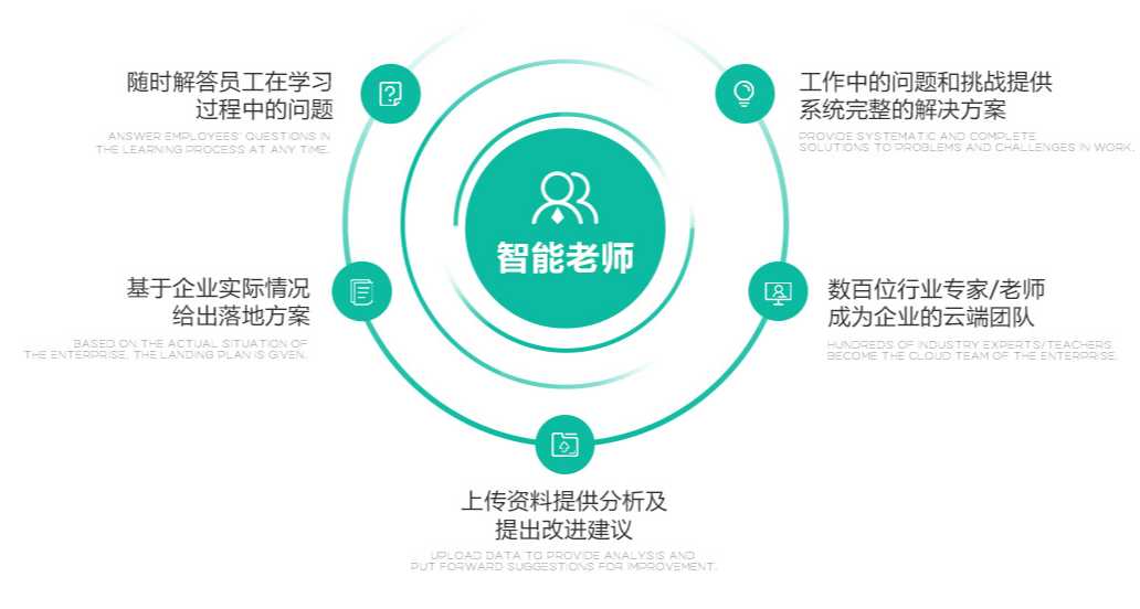 2. 智能老师上百位行业专家/老师成为企业的云端团队,各领域资深专家,24小时随时待命。为企业制定方案与策略,让专业力量直接服务于企业发展。无论是上传资料提供分析及提出改进建议,还是随时解答员工在学习过程中的问题,智能老师都能提供全面、专业的指导和完整的解决方案,深化对知识的理解和掌握。